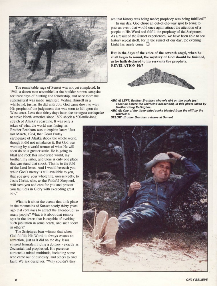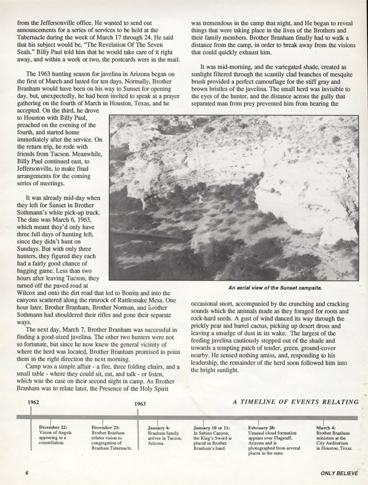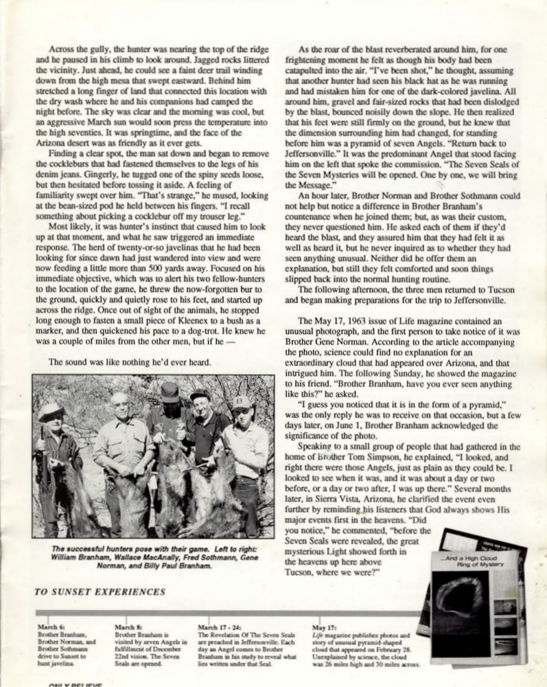An article in Life Magazine (May 17, 1963)—"High Cloud Ring of Mystery" over Arizona—caught Brother Norman's attention while visiting and he borrowed the magazine. When Brother Branham came by the following Sunday to take the Normans to dinner, he recognized the Cloud as that into which he was caught up from Sunset Mountain where he was hunting with Brothers Gene Norman and Fred Sothman on about March 8, 1963. He borrowed the magazine and reported his discovery to the Church on Saturday, June 1, 1963 in his sermon"Come, follow Me" (63-0601, par. 13-16). Also see "Standing in the Gap (63-0623M, par. 82), and "Is Your Life worthy of the Gospel? (63-0630E, par. 6-7).