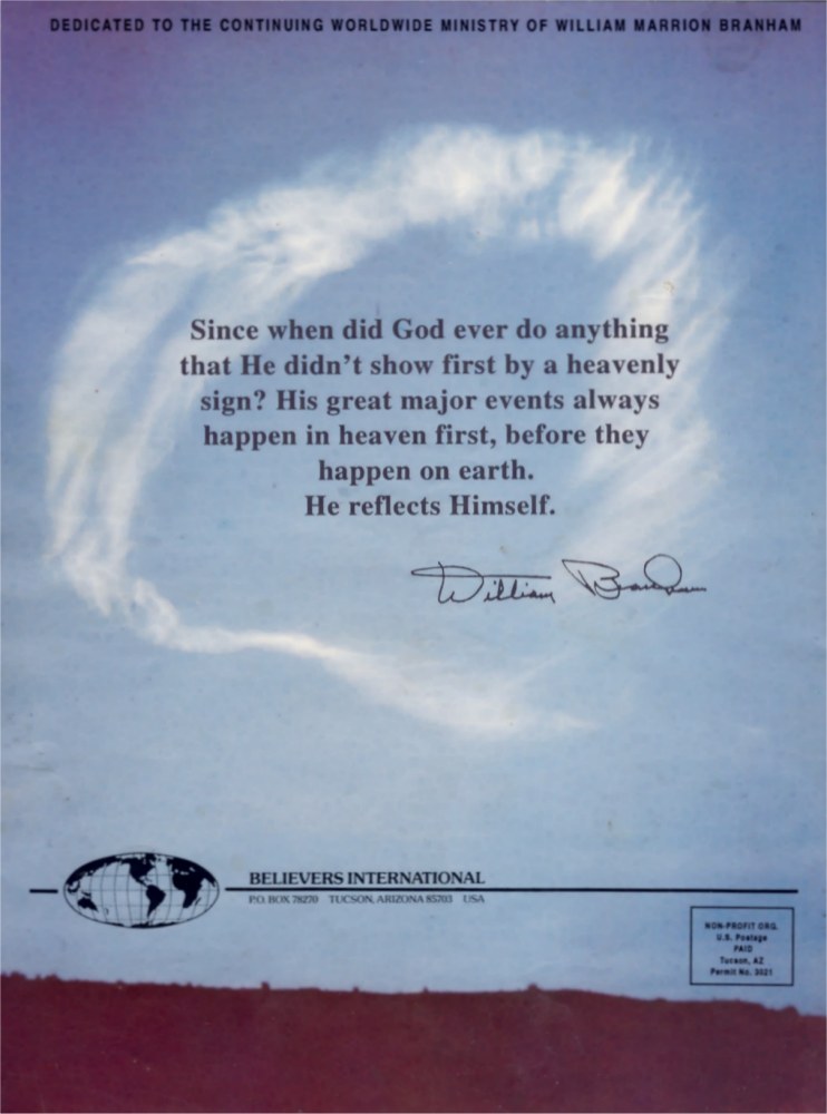 Before I reply to our Brother on the Cloud please read the wonderful testimonials to Brother Branham's ministry on the believethesign website affirming what they have not understood. That the God of Abraham, Isaac and Israel veiled Himself behind this sinner saved by grace—revealing "Jesus Christ, the same yesterday, and today, and forever" by the Messianic sign of Hebrews 4:12 as He veiled Himself behind the virgin-born Man of the Gospels and the created Man in the days of Lot (Genesis 18). Luke 17:28-30, the last sign promised to us Gentiles is fulfilled, "for God so loved the world that He gave His only begotten Son, that whoever believes in Him should not perish, but have eternal Life":